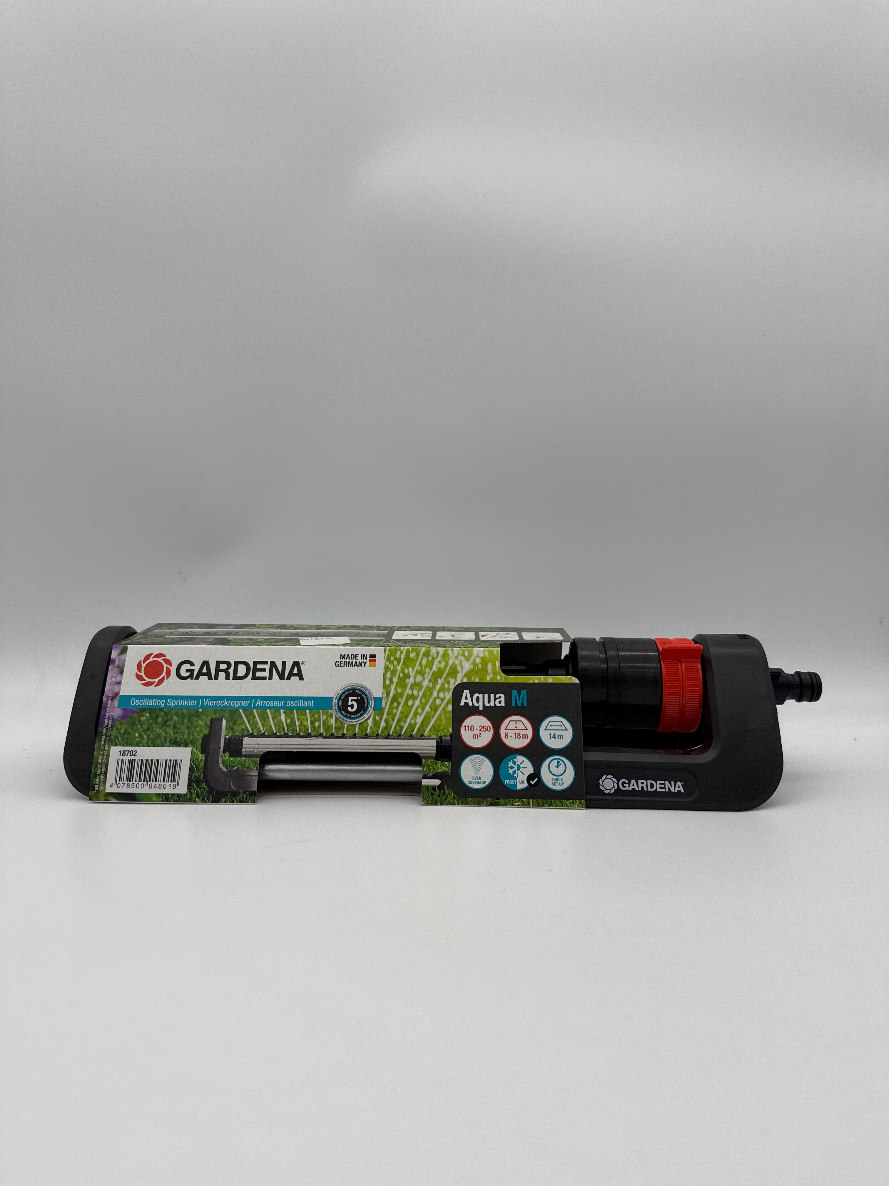 De Gardena Zwenksproeier Aqua M zorgt voor een perfect gelijkmatige en nauwkeurige beregening van middelgrote grasvelden en tuinen. Dankzij de geavanceerde sproeitechniek worden plassen en droge plekken voorkomen — het volledige gebied krijgt exact de juiste hoeveelheid water.