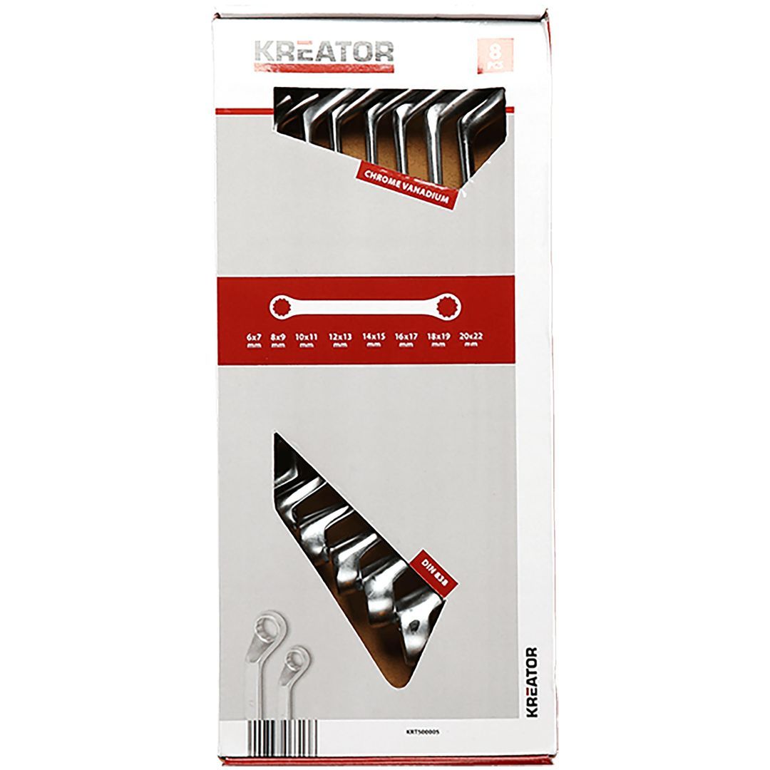 Met deze 8-delige ringsleutelset van Kreator draai je elke moer of bout in een handomdraai vast of los. Omdat de gesatineerde chroom-vanadium sleutels aan beide kanten een andere grootte hebben, beschik je over maar liefst 16 verschillende maten. De ringsleutels hebben diepgebogen ringen, zodat je kracht efficiënter wordt overgebracht.