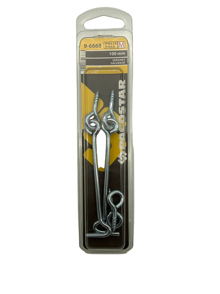 Verzinkte windhaken met bijhorende oogschroeven, lengte 100 mm. Ideaal voor het veilig vergrendelen of op kier zetten van deuren, ramen, poorten, tuinhekken, luiken en stallingen. De stevige haakconstructie zorgt voor een betrouwbare sluiting, terwijl de verzinkte afwerking langdurige bescherming biedt tegen roest en weersinvloeden.