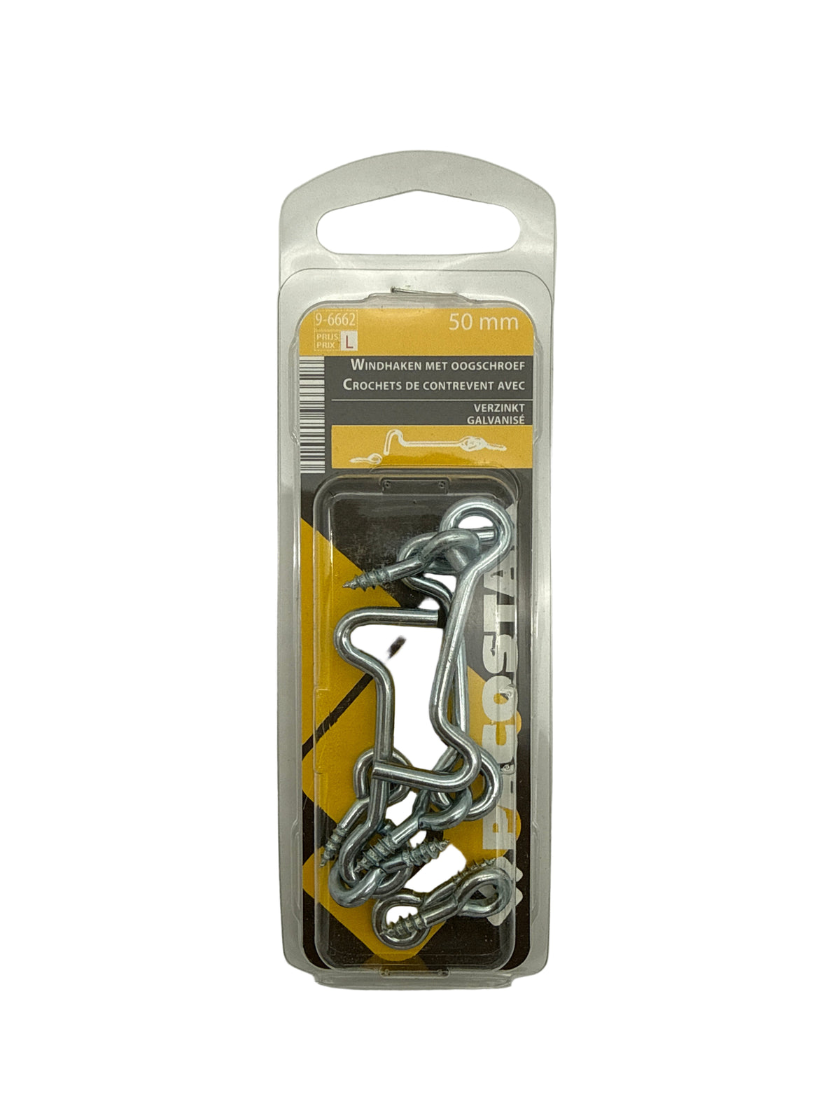 Verzinkte windhaken met bijhorende oogschroeven, afmeting 50 mm, verpakking van 3 stuks. Ideaal voor het vastzetten, vergrendelen of op kieren houden van ramen, deuren, poorten, tuinhekken en luiken. Dankzij de verzinkte afwerking zijn de haken goed beschermd tegen roest en weersinvloeden, waardoor ze geschikt zijn voor zowel binnen- als buitengebruik.